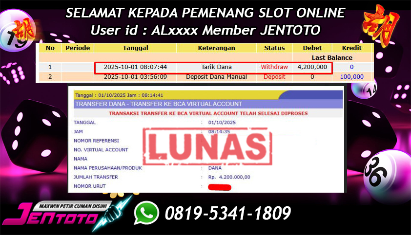 Selamat Kepada Member Jentoto dengan User ID : AL***, hari ini tanggal 01 Oktober 2025 berhasil memenangkan JP di permainan slot gacor maxwin Pragmatic Play hari ini dengan nominal sebesar Rp 4.200.000 dan sudah di bayar LUNAS!!