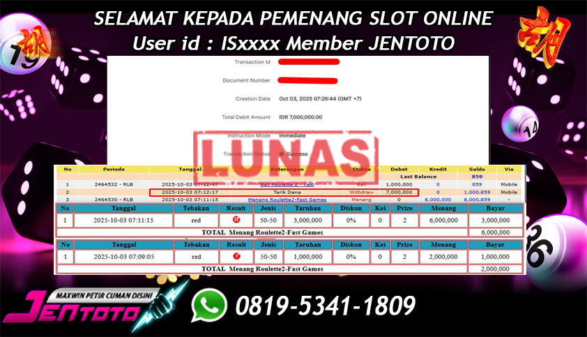 Selamat Kepada Member Jentoto dengan User ID: IS*****, hari ini tanggal 03 Oktober 2025 berhasil memenangkan JP di permainan live casino Roulette2-Fast Games hari ini dengan nominal sebesar Rp 7.000.000 dan sudah di bayar LUNAS!!