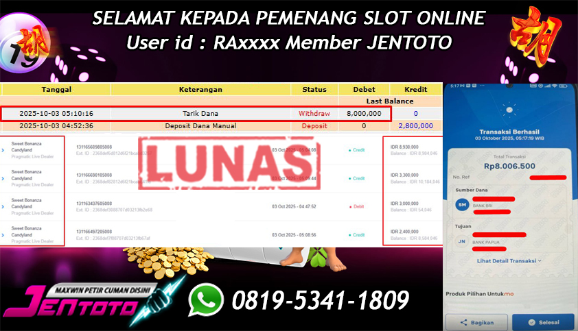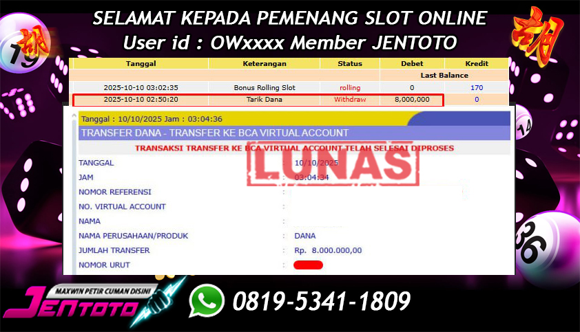 Selamat Kepada Member Jentoto dengan User ID : OW***, hari ini tanggal 10 Oktober 2025 berhasil memenangkan JP di permainan slot gacor maxwin Pragmatic Play hari ini dengan nominal sebesar Rp 8.000.000 dan sudah di bayar LUNAS!!
