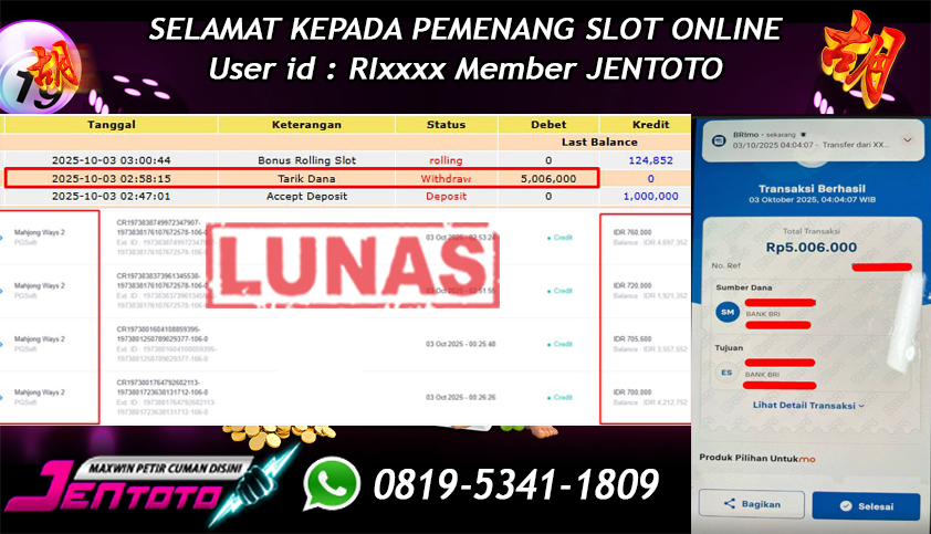 Selamat Kepada Member Jentoto dengan User ID : RI****, hari ini tanggal 03 Oktober 2025 berhasil memenangkan JP di permainan slot gacor maxwin PG Soft hari ini dengan nominal sebesar Rp 5.006.000 dan sudah di bayar LUNAS!