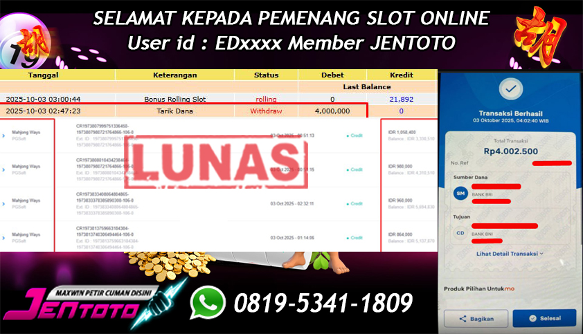 Selamat Kepada Member Jentoto dengan User ID : ED****, hari ini tanggal 03 Oktober 2025 berhasil memenangkan JP di permainan slot gacor maxwin PG Soft hari ini dengan nominal sebesar Rp 4.000.000 dan sudah di bayar LUNAS!