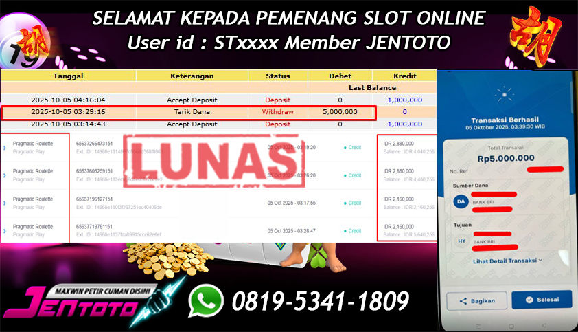 Selamat Kepada Member Jentoto dengan User ID: ST*****, hari ini tanggal 05 Oktober 2025 berhasil memenangkan JP di permainan live casino pp pragmatic roulette hari ini dengan nominal sebesar Rp 5.000.000 sudah di bayar LUNAS!!