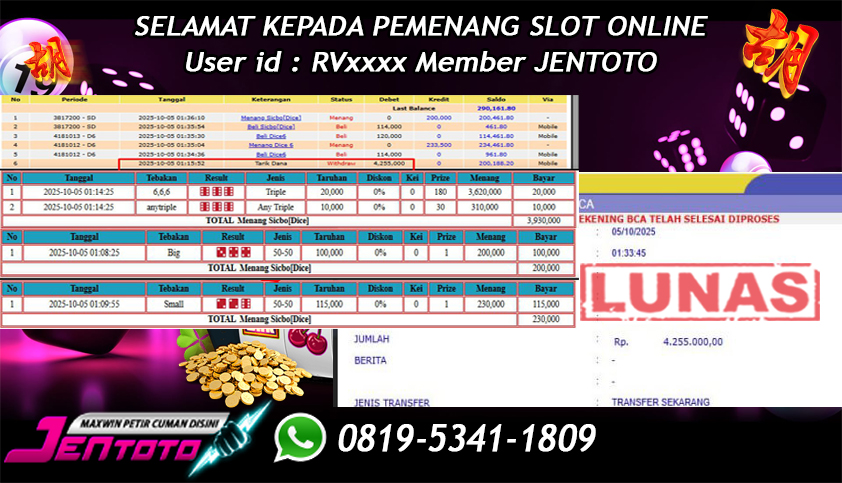 Selamat Kepada Member Jentoto dengan User ID: RV*****, hari ini tanggal 05 Oktober 2025 berhasil memenangkan JP di permainan live casino sicbo dice online hari ini dengan nominal sebesar Rp 4.255.000 dan sudah di bayar LUNAS!!