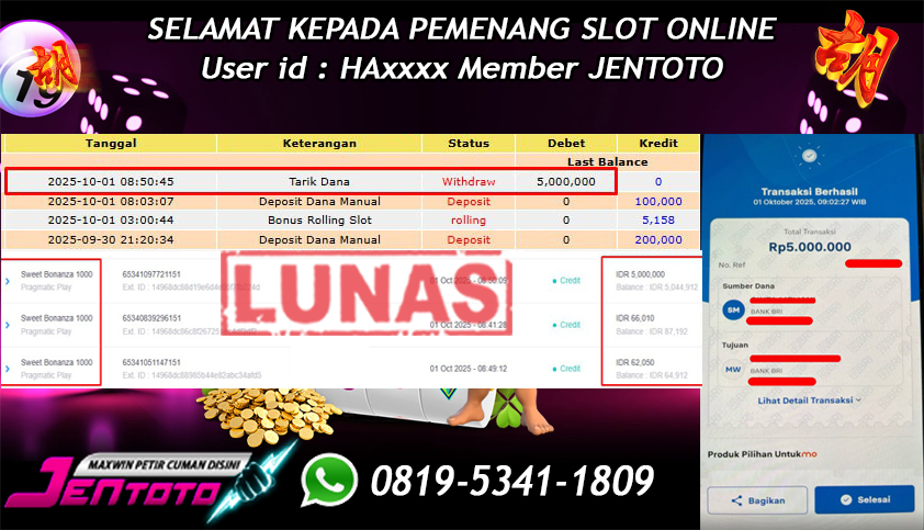 Selamat Kepada Member Jentoto dengan User ID : HA*****, hari ini tanggal 01 Oktober 2025 berhasil memenangkan JP di permainan slot gacor maxwin Pragmatic Play hari ini dengan nominal sebesar Rp 5.000.000 dan sudah di bayar LUNAS!!