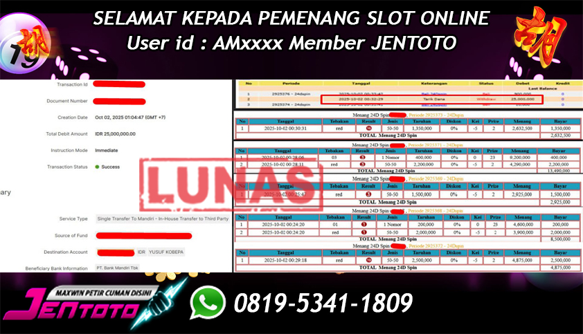Selamat Kepada Member Jentoto dengan User ID: AM*****, hari ini tanggal 02 Oktober 2025 berhasil memenangkan JP di permainan live casino 24D Spin hari ini dengan nominal sebesar Rp 25.000.000 dan sudah di bayar LUNAS!!