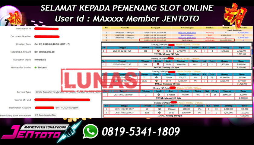 Selamat Kepada Member Jentoto dengan User ID: MA*****, hari ini tanggal 02 Oktober 2025 berhasil memenangkan JP di permainan live casino 24D Spin hari ini dengan nominal sebesar Rp 30.000.000 dan sudah di bayar LUNAS!!