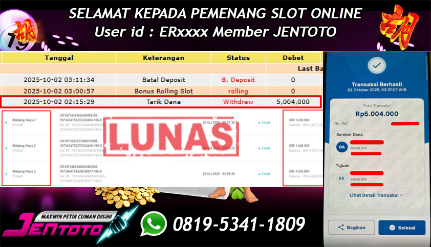 Selamat Kepada Member Jentoto dengan User ID : ER****, hari ini tanggal 02 Oktober 2025 berhasil memenangkan JP di permainan slot gacor maxwin PG Soft hari ini dengan nominal sebesar Rp 5.004.000 dan sudah di bayar LUNAS!
