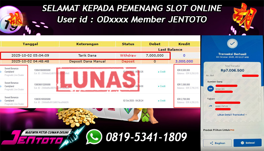 Selamat Kepada Member Jentoto dengan User ID : OD*****, hari ini tanggal 02 Oktober 2025 berhasil memenangkan JP di permainan slot gacor maxwin Pragmatic Play hari ini dengan nominal sebesar Rp 7.000.000 dan sudah di bayar LUNAS!!