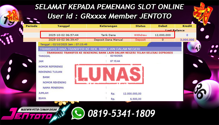 Selamat Kepada Member Jentoto dengan User ID : GR*****, hari ini tanggal 02 Oktober 2025 berhasil memenangkan JP di permainan slot gacor maxwin Pragmatic Play hari ini dengan nominal sebesar Rp 12.000.000 dan sudah di bayar LUNAS!!