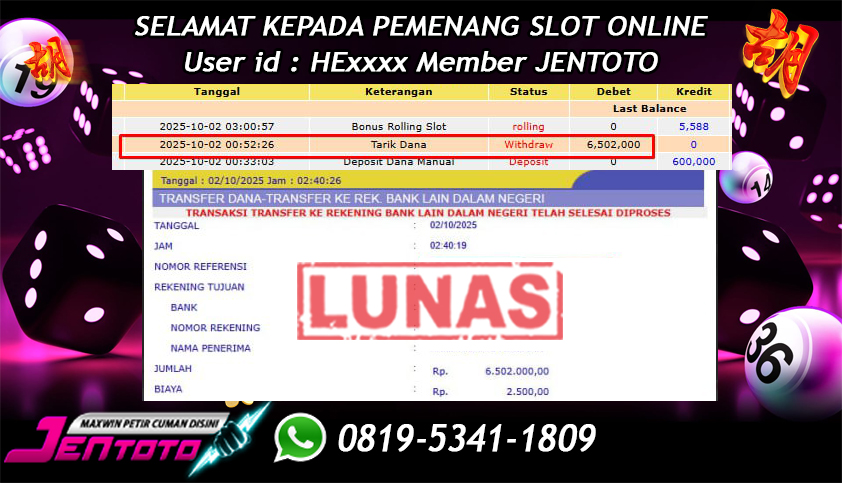 Selamat Kepada Member Jentoto dengan User ID : HE*****, hari ini tanggal 02 Oktober 2025 berhasil memenangkan JP di permainan slot gacor maxwin Pragmatic Play hari ini dengan nominal sebesar Rp 6.502.000 dan sudah di bayar LUNAS!!