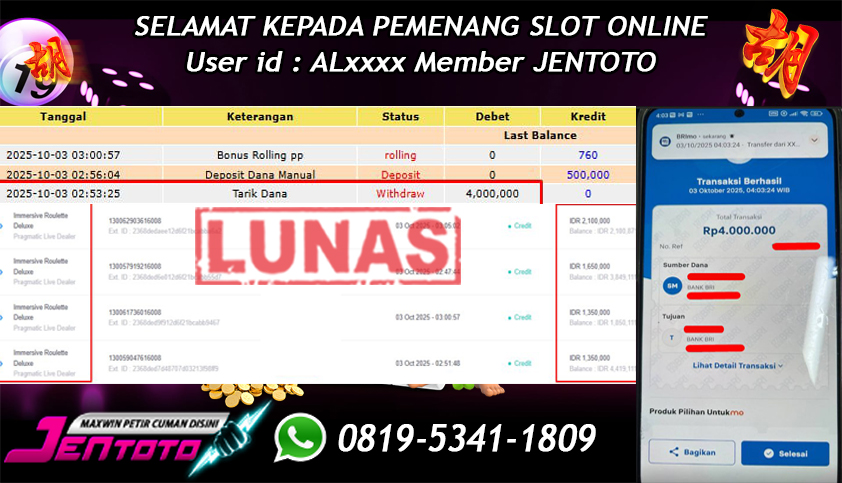 Selamat Kepada Member Jentoto dengan User ID: AL*****, hari ini tanggal 03 Oktober 2025 berhasil memenangkan JP di permainan live casino Immersive Roulette Deluxe hari ini dengan nominal sebesar Rp 4.000.000 dan sudah di bayar LUNAS!!