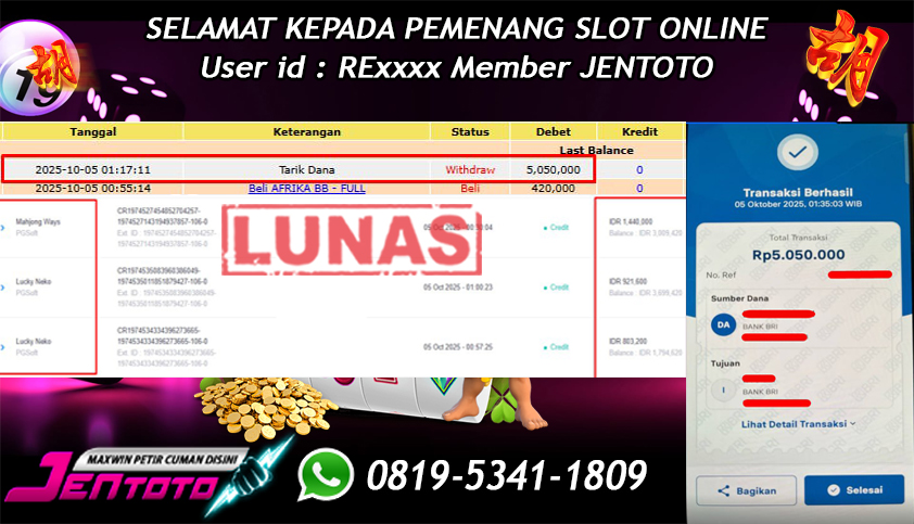 Selamat Kepada Member Jentoto dengan User ID : RE****, hari ini tanggal 05 Oktober 2025 berhasil memenangkan JP di permainan slot gacor maxwin PG Soft hari ini dengan nominal sebesar Rp 5.050.000 dan sudah di bayar LUNAS!