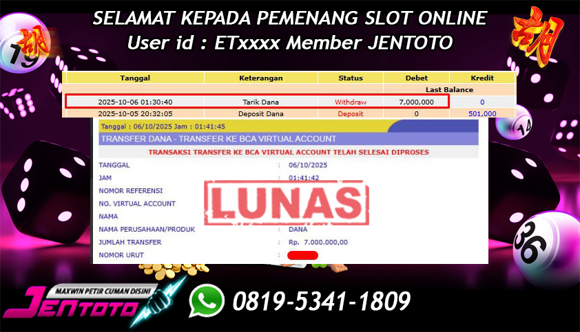 Selamat Kepada Member Jentoto dengan User ID : ET****, hari ini tanggal 06 Oktober 2025 berhasil memenangkan JP di permainan slot gacor maxwin PG Soft hari ini dengan nominal sebesar Rp 7.000.000 dan sudah di bayar LUNAS!