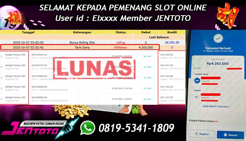Selamat Kepada Member Jentoto dengan User ID : EI****, hari ini tanggal 07 Oktober 2025 berhasil memenangkan JP di permainan slot gacor maxwin Pragmatic Play hari ini dengan nominal sebesar Rp 4.263.000 dan sudah di bayar LUNAS!!