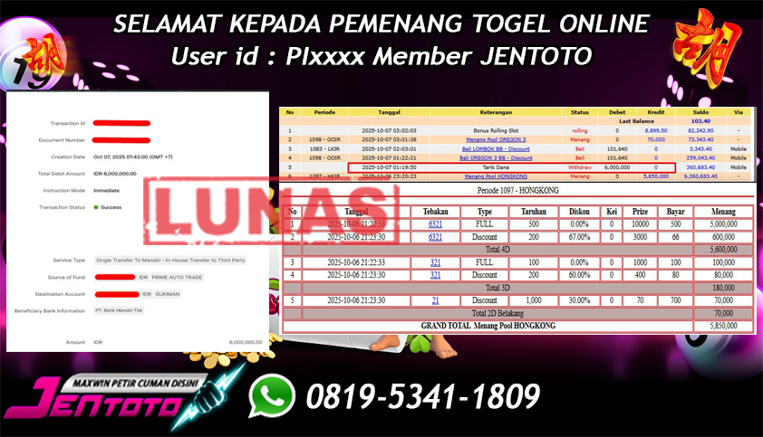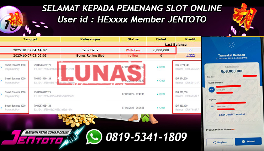 Selamat Kepada Member Jentoto dengan User ID : HE*****, hari ini tanggal 07 Oktober 2025 berhasil memenangkan JP di permainan slot gacor maxwin Pragmatic Play hari ini dengan nominal sebesar Rp 6.000.000 dan sudah di bayar LUNAS!!