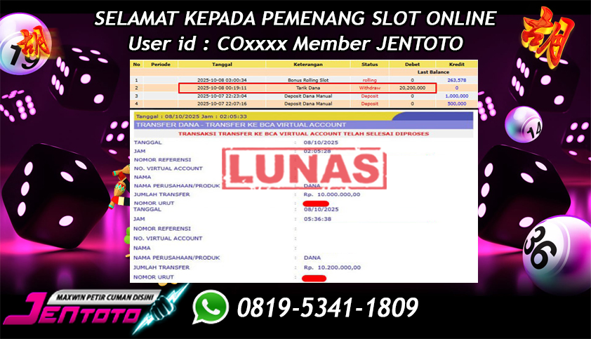 Selamat Kepada Member Jentoto dengan User ID : CO****, hari ini tanggal 08 Oktober 2025 berhasil memenangkan JP di permainan slot gacor maxwin PG Soft hari ini dengan nominal sebesar Rp 20.200.000 dan sudah di bayar LUNAS!
