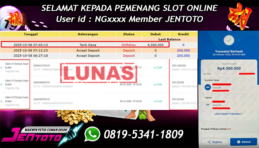 Selamat Kepada Member Jentoto dengan User ID : NG***, hari ini tanggal 08 Oktober 2025 berhasil memenangkan JP di permainan slot gacor maxwin Pragmatic Play hari ini dengan nominal sebesar Rp 4.300.000 dan sudah di bayar LUNAS!!