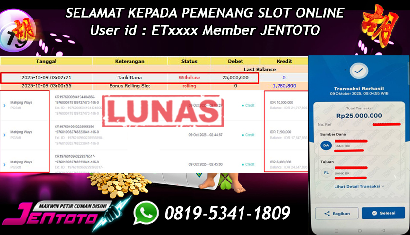 Selamat Kepada Member Jentoto dengan User ID : ET****, hari ini tanggal 09 Oktober 2025 berhasil memenangkan JP di permainan slot gacor maxwin PG Soft hari ini dengan nominal sebesar Rp 25.000.000 dan sudah di bayar LUNAS!