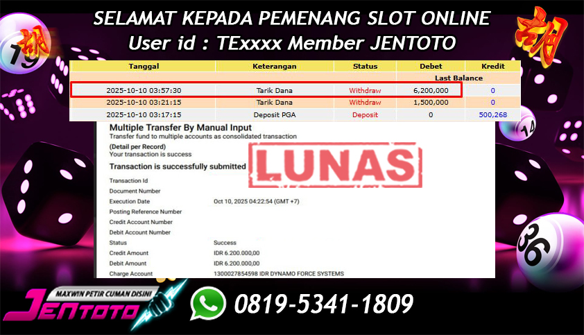 Selamat Kepada Member Jentoto dengan User ID : TE****, hari ini tanggal 10 Oktober 2025 berhasil memenangkan JP di permainan slot gacor maxwin PG Soft hari ini dengan nominal sebesar Rp 6.200.000 dan sudah di bayar LUNAS!