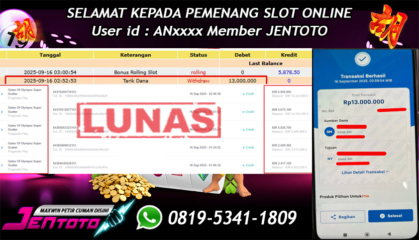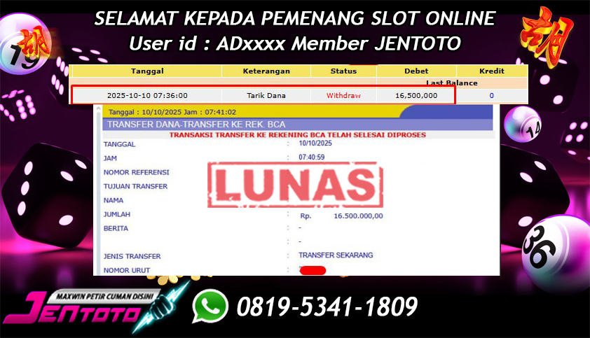 Selamat Kepada Member Jentoto dengan User ID : AD***, hari ini tanggal 10 Oktober 2025 berhasil memenangkan JP di permainan slot gacor maxwin Pragmatic Play hari ini dengan nominal sebesar Rp 16.500.000 dan sudah di bayar LUNAS!!