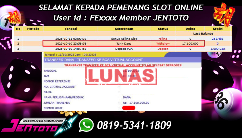 Selamat Kepada Member Jentoto dengan User ID : FE****, hari ini tanggal 10 Oktober 2025 berhasil memenangkan JP di permainan slot gacor maxwin PG Soft hari ini dengan nominal sebesar Rp 17.100.000 dan sudah di bayar LUNAS!