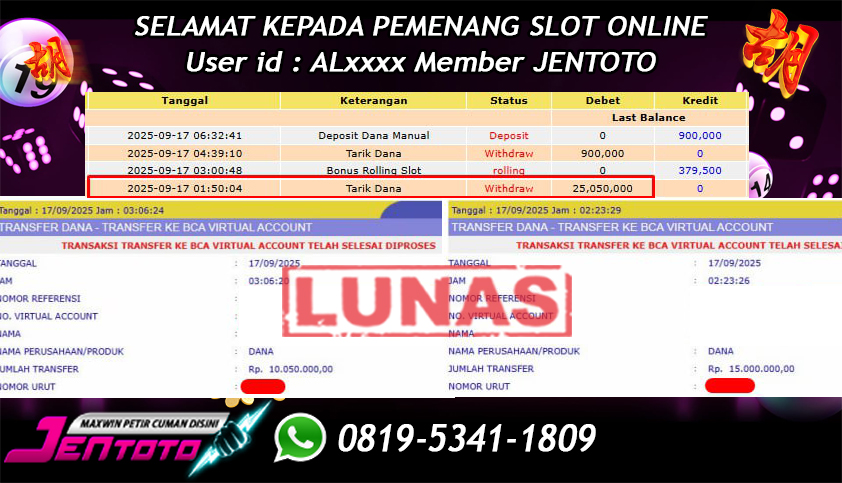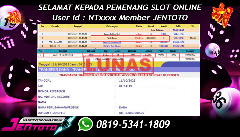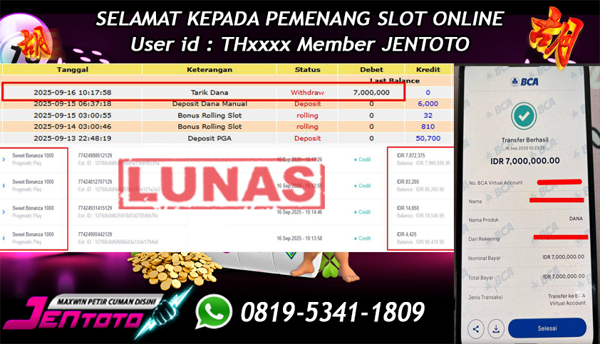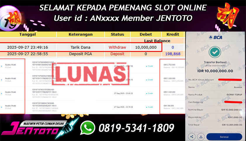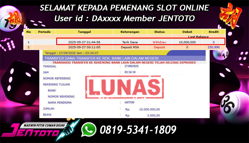 Selamat Kepada Member Jentoto dengan User ID : ND***, hari ini tanggal 27 September 2025 berhasil memenangkan JP di permainan slot gacor maxwin Pragmatic Play hari ini dengan nominal sebesar Rp 10.000.000 dan sudah di bayar LUNAS!!