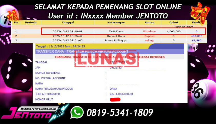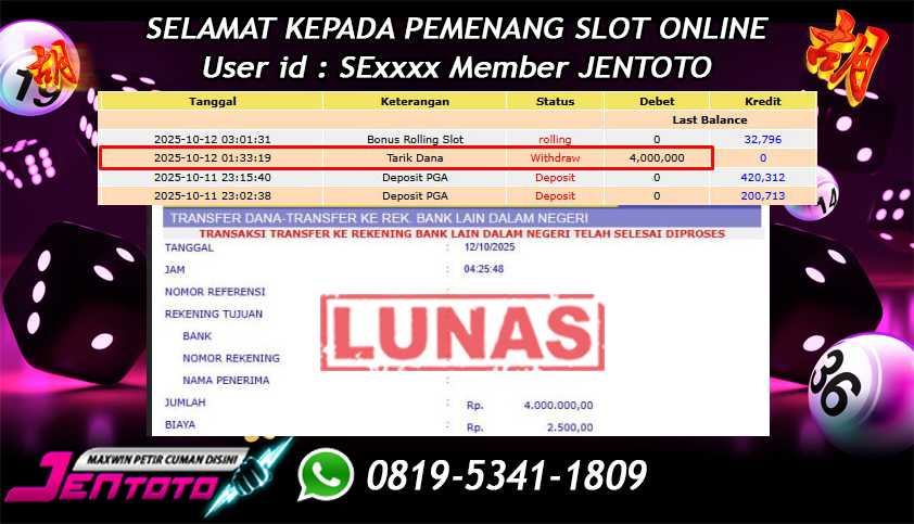 Selamat Kepada Member Jentoto dengan User ID : SE***, hari ini tanggal 12 Oktober 2025 berhasil memenangkan JP di permainan slot gacor maxwin Pragmatic Play hari ini dengan nominal sebesar Rp 4.000.000 dan sudah di bayar LUNAS!!