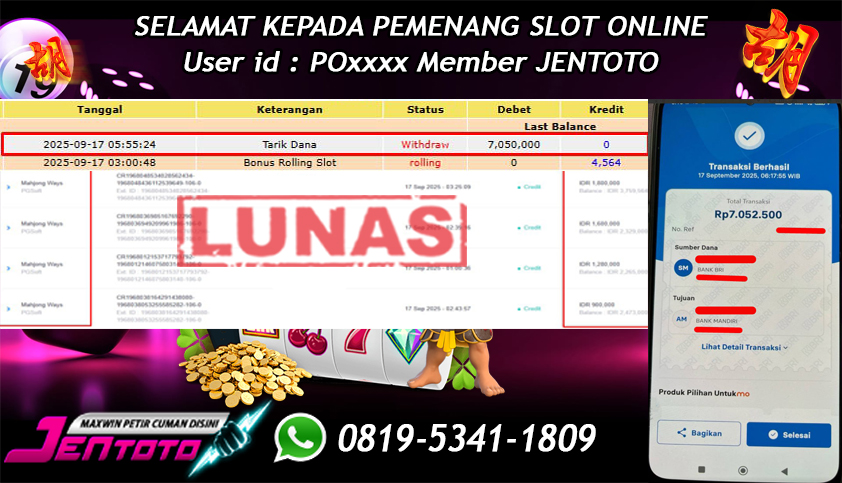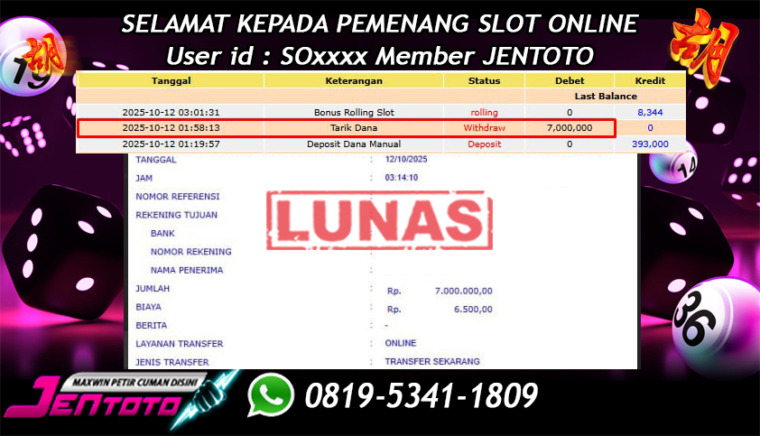 Selamat Kepada Member Jentoto dengan User ID : SO****, hari ini tanggal 12 Oktober 2025 berhasil memenangkan JP di permainan slot gacor maxwin PG Soft hari ini dengan nominal sebesar Rp 7.000.000 dan sudah di bayar LUNAS!