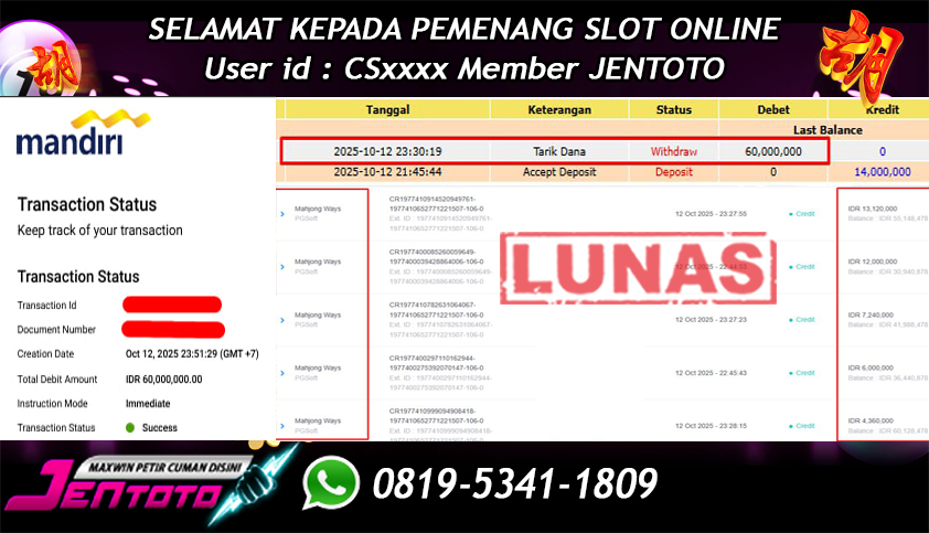 Selamat Kepada Member Jentoto dengan User ID : CS****, hari ini tanggal 12 Oktober 2025 berhasil memenangkan JP di permainan slot gacor maxwin PG Soft hari ini dengan nominal sebesar Rp 60.000.000 dan sudah di bayar LUNAS!