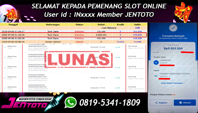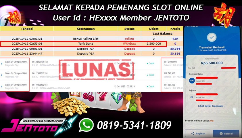 Selamat Kepada Member Jentoto dengan User ID : HE***, hari ini tanggal 12 Oktober 2025 berhasil memenangkan JP di permainan slot gacor maxwin Pragmatic Play hari ini dengan nominal sebesar Rp 5.500.000 dan sudah di bayar LUNAS!!