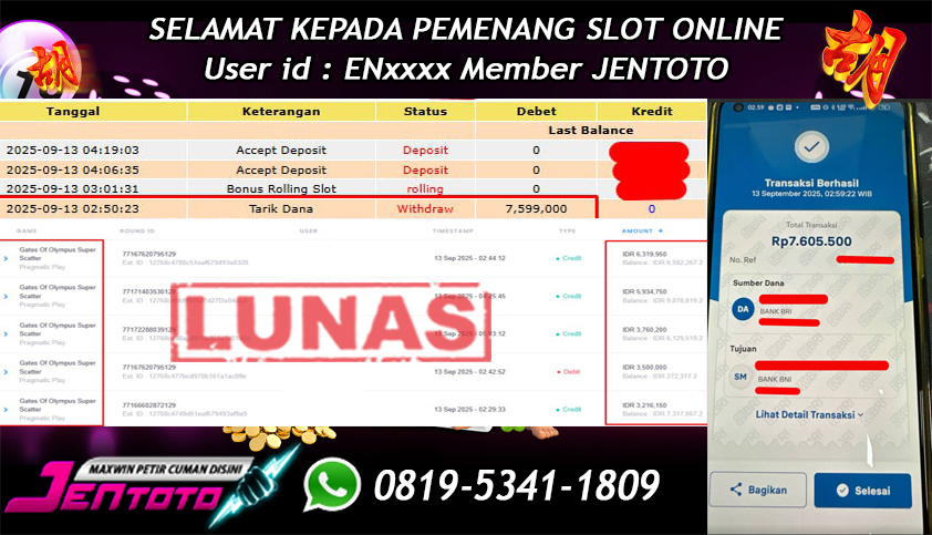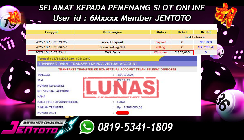 Selamat Kepada Member Jentoto dengan User ID : 6M***, hari ini tanggal 13 Oktober 2025 berhasil memenangkan JP di permainan slot gacor maxwin Pragmatic Play hari ini dengan nominal sebesar Rp 5.795.000 dan sudah di bayar LUNAS!!