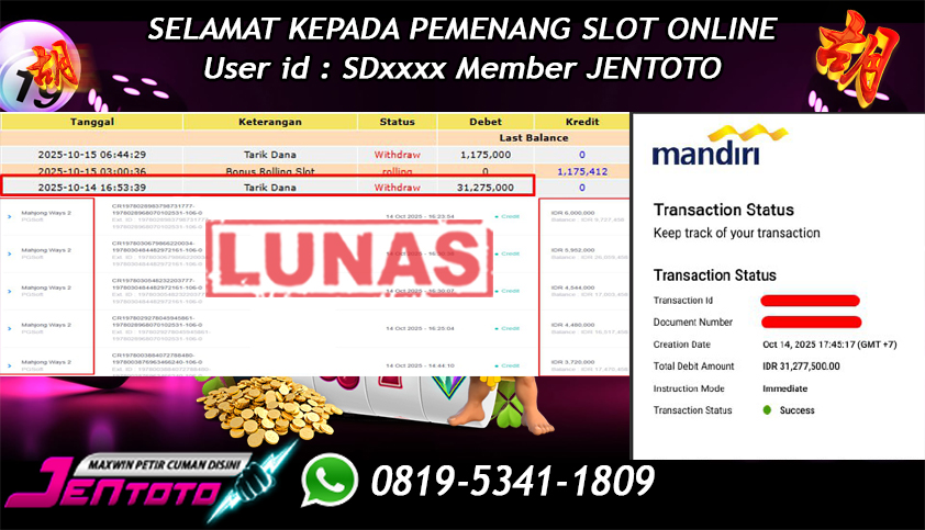 Selamat Kepada Member Jentoto dengan User ID : SD****, hari ini tanggal 14 Oktober 2025 berhasil memenangkan JP di permainan slot gacor maxwin PG Soft hari ini dengan nominal sebesar Rp 31.275.000 dan sudah di bayar LUNAS!