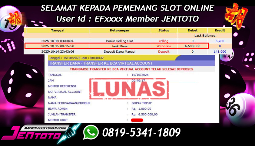 Selamat Kepada Member Jentoto dengan User ID : EF****, hari ini tanggal 15 Oktober 2025 berhasil memenangkan JP di permainan slot gacor maxwin PG Soft hari ini dengan nominal sebesar Rp 6.500.000 dan sudah di bayar LUNAS!