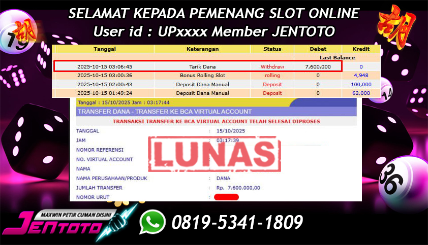Selamat Kepada Member Jentoto dengan User ID : UP****, hari ini tanggal 15 Oktober 2025 berhasil memenangkan JP di permainan slot gacor maxwin PG Soft hari ini dengan nominal sebesar Rp 7.600.000 dan sudah di bayar LUNAS!