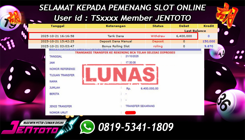 Selamat Kepada Member Jentoto dengan User ID : TS****, hari ini tanggal 21 Oktober 2025 berhasil memenangkan JP di permainan slot gacor maxwin Pragmatic Play hari ini dengan nominal sebesar Rp 6.400.000 dan sudah di bayar LUNAS!!