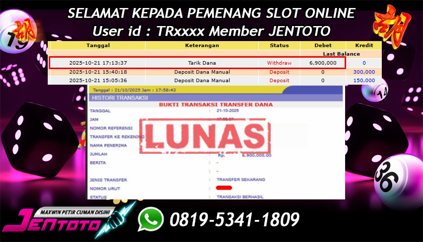 Selamat Kepada Member Jentoto dengan User ID : TR***, hari ini tanggal 21 Oktober 2025 berhasil memenangkan JP di permainan slot gacor maxwin Pragmatic Play hari ini dengan nominal sebesar Rp 6.900.000 dan sudah di bayar LUNAS!!