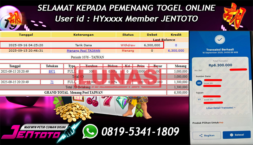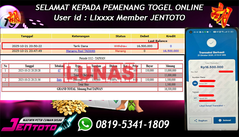 Selamat kepada User id Jentoto : LI*** pada hari ini, tanggal 21 Oktober 2025 berhasil memenangkan JP Paus di permainan togel taiwan pools dengan total hadiah kemenangan Rp. 16.500.000 dan Di BAYAR LUNAS!