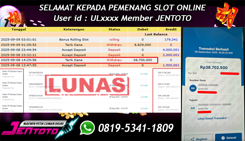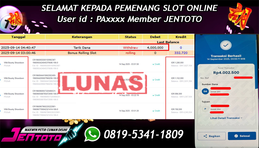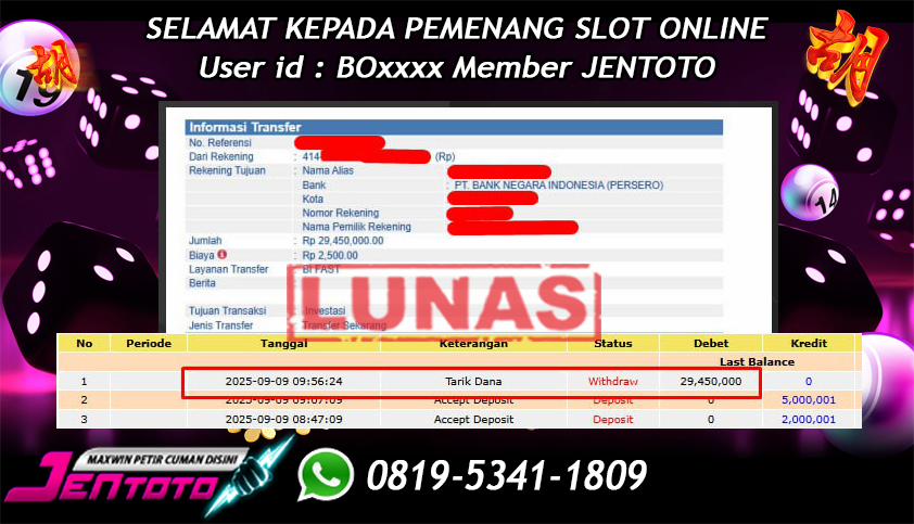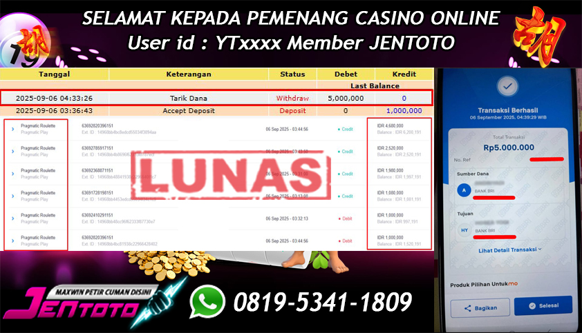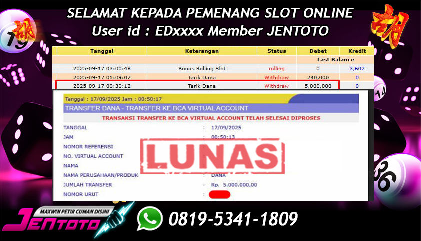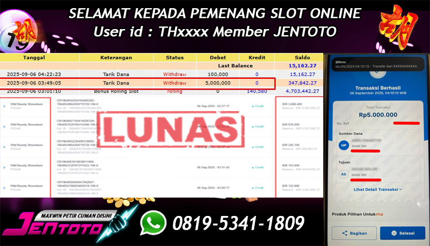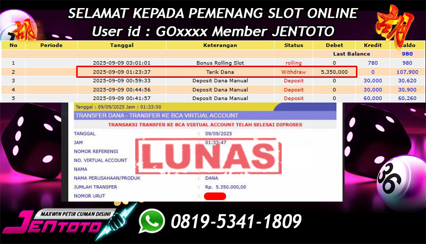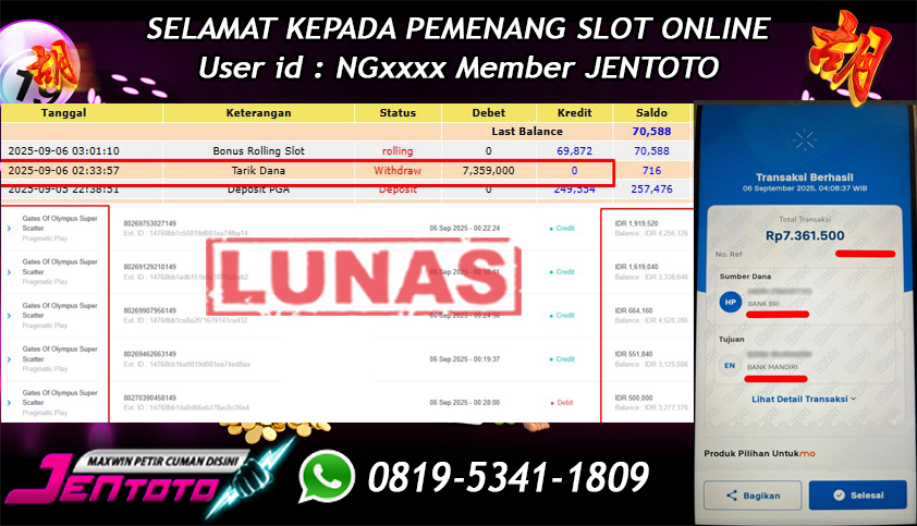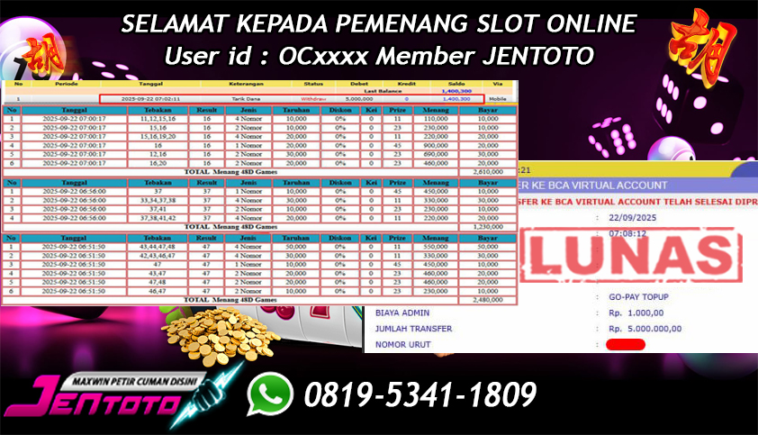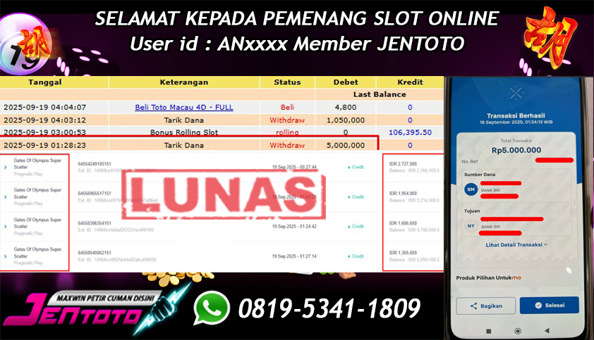 Selamat Kepada Member Jentoto dengan User ID : NG***, hari ini tanggal 19 September 2025 berhasil memenangkan JP di permainan slot gacor maxwin Pragmatic Play hari ini dengan nominal sebesar Rp 5.000.000 dan sudah di bayar LUNAS!!