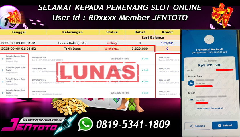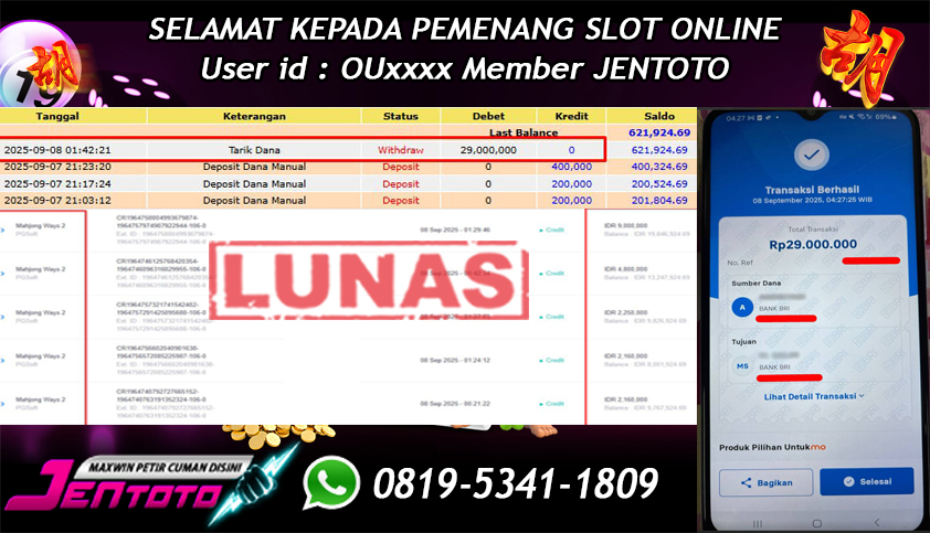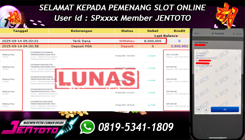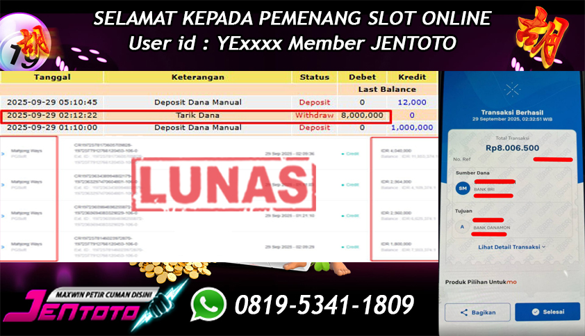 Selamat Kepada Member Jentoto dengan User ID : KO****, hari ini tanggal 29 September 2025 berhasil memenangkan JP di permainan slot gacor maxwin PG Soft hari ini dengan nominal sebesar Rp 8.000.000 dan sudah di bayar LUNAS!