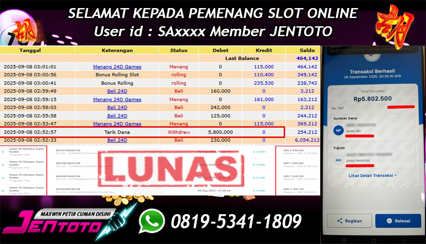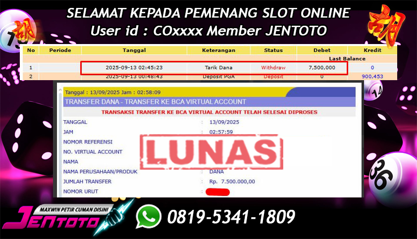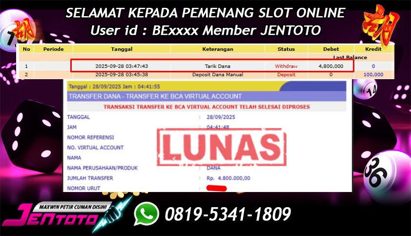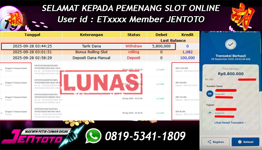 Selamat Kepada Member Jentoto dengan User ID : WH****, hari ini tanggal 28 September 2025 berhasil memenangkan JP di permainan slot gacor maxwin PG Soft hari ini dengan nominal sebesar Rp 5.800.000 dan sudah di bayar LUNAS!
