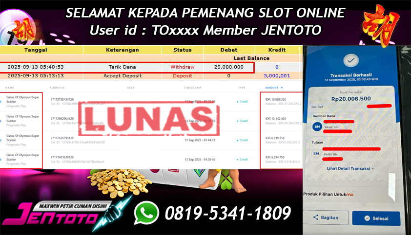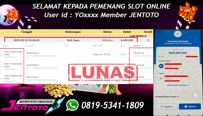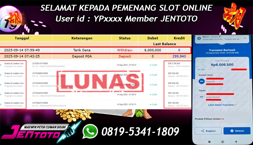 Selamat Kepada Member Jentoto dengan User ID : EP***, hari ini tanggal 20 September 2025 berhasil memenangkan JP di permainan slot gacor maxwin Pragmatic Play hari ini dengan nominal sebesar Rp 6.000.000 dan sudah di bayar LUNAS!!