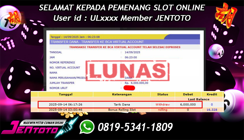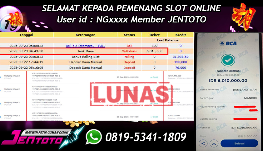 Selamat Kepada Member Jentoto dengan User ID : DJ****, hari ini tanggal 23 September 2025 berhasil memenangkan JP di permainan slot gacor maxwin PG Soft hari ini dengan nominal sebesar Rp 6.010.000 dan sudah di bayar LUNAS!