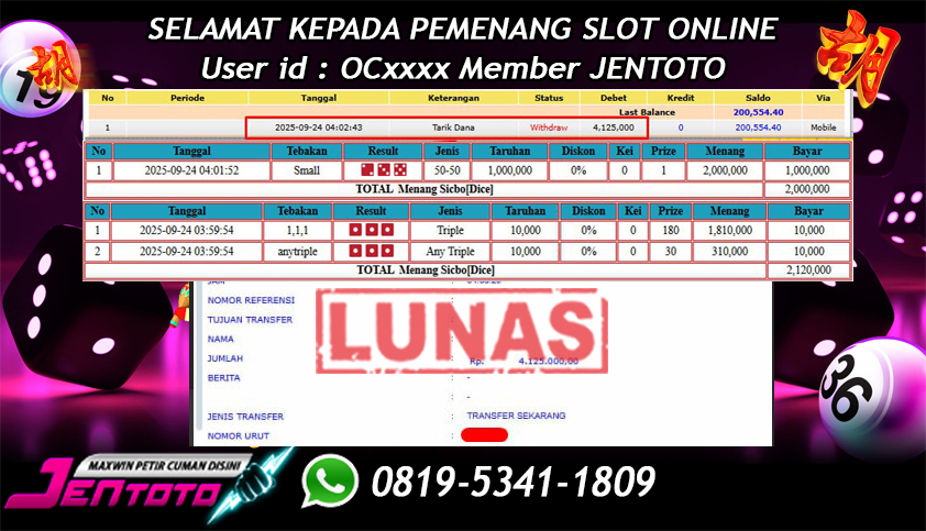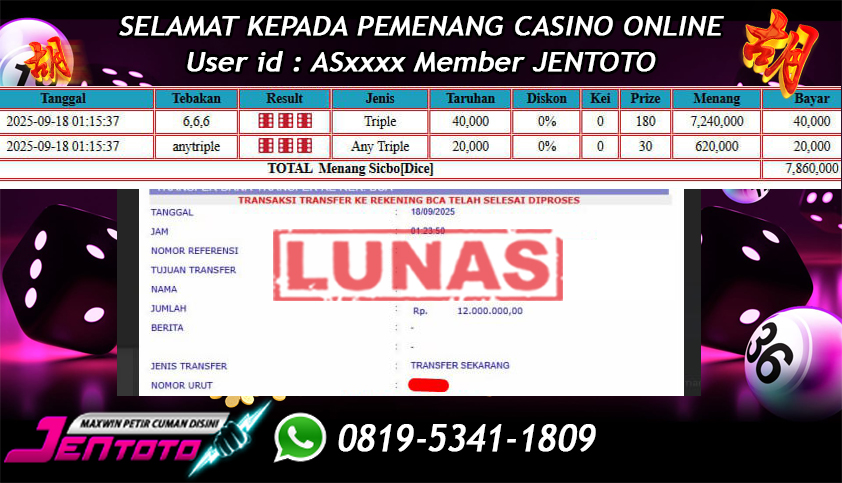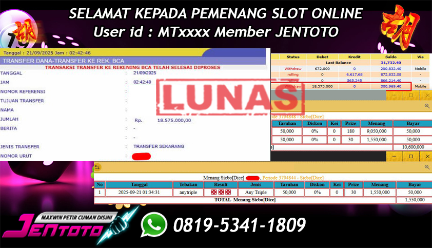 Selamat Kepada Member Jentoto dengan User ID: NG*****, hari ini tanggal 21 September 2025 berhasil memenangkan JP di permainan live casino sicbo online hari ini dengan nominal sebesar Rp 18.575.000 dan sudah di bayar LUNAS!!