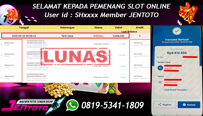 Selamat Kepada Member Jentoto dengan User ID : IN****, hari ini tanggal 18 September 2025 berhasil memenangkan JP di permainan slot gacor maxwin PG Soft hari ini dengan nominal sebesar Rp 9.606.000 dan sudah di bayar LUNAS!