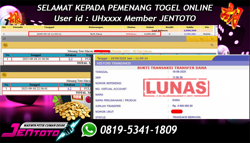 Selamat datang di halaman Bukti JP JEN Toto. Di sini saya akan membagikan bukti dan hasil kemenangan member JENTOTO di bayar lunas dan tanpa adanya hasil editan sedikitpun.