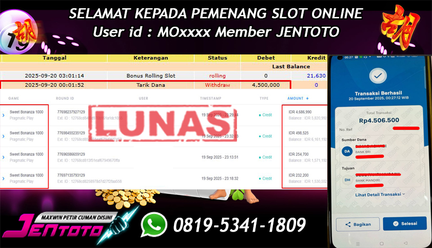 Selamat Kepada Member Jentoto dengan User ID : YS***, hari ini tanggal 20 September 2025 berhasil memenangkan JP di permainan slot gacor maxwin Pragmatic Play hari ini dengan nominal sebesar Rp 4.500.000 dan sudah di bayar LUNAS!!