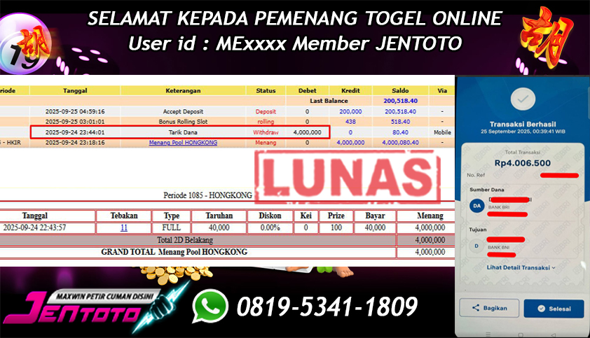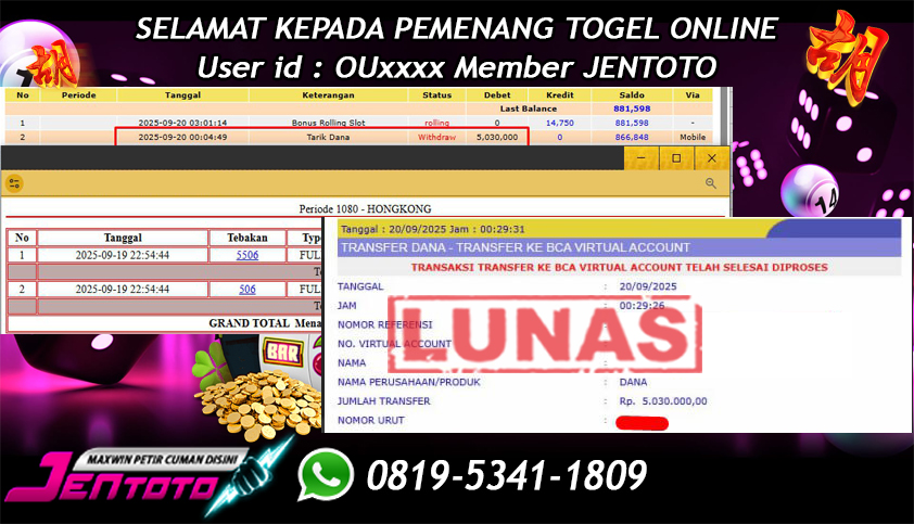 Selamat kepada User id Jentoto : NA*** pada hari ini, tanggal 20 September 2023 berhasil memenangkan JP Paus di permainan Togel Hongkong dengan total hadiah kemenangan Rp. 5.030.000 dan Di BAYAR LUNAS!!