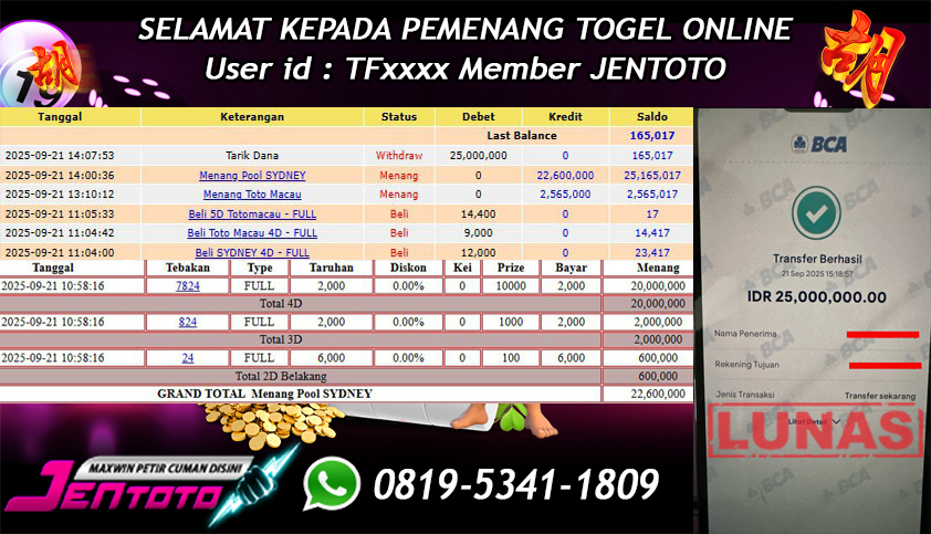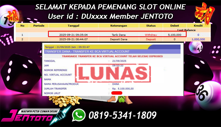 Selamat Kepada Member Jentoto dengan User ID : AM****, hari ini tanggal 21 September 2025 berhasil memenangkan JP di permainan slot gacor maxwin PG Soft hari ini dengan nominal sebesar Rp 5.100.000 dan sudah di bayar LUNAS!