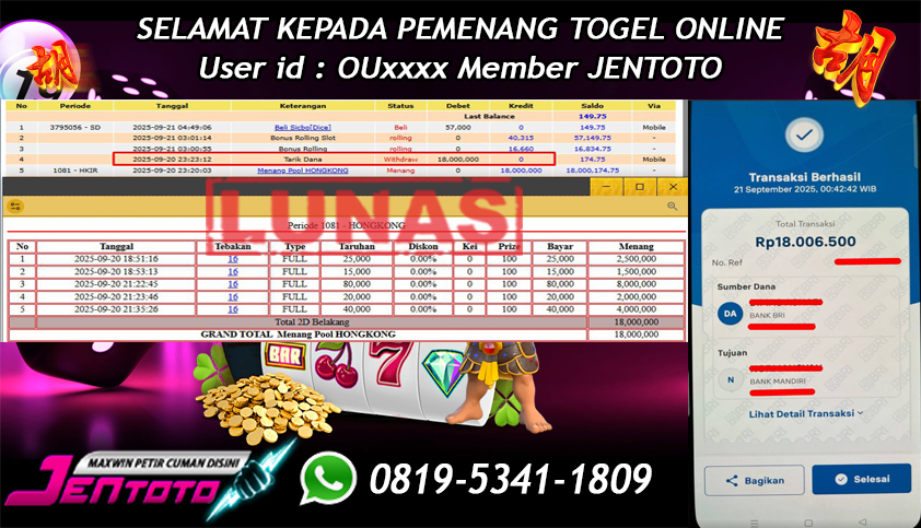 Selamat kepada User id Jentoto : YM*** pada hari ini, tanggal 21 September 2023 berhasil memenangkan JP Paus di permainan Togel Hongkong dengan total hadiah kemenangan Rp. 18.000.000 dan Di BAYAR LUNAS!!