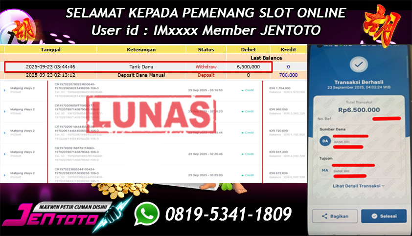 Selamat Kepada Member Jentoto dengan User ID : TI****, hari ini tanggal 23 September 2025 berhasil memenangkan JP di permainan slot gacor maxwin PG Soft hari ini dengan nominal sebesar Rp 6.500.000 dan sudah di bayar LUNAS!
